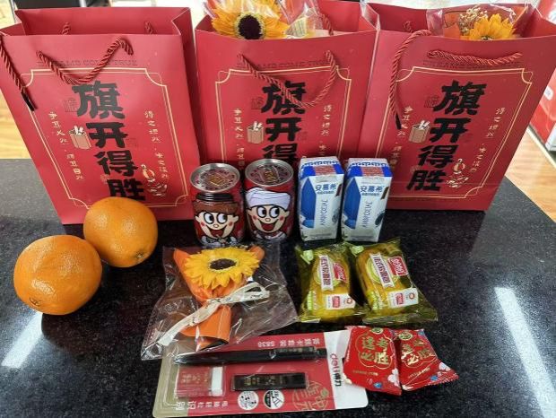活動(dòng)現(xiàn)場(chǎng),領(lǐng)導(dǎo)老師們逐一為學(xué)子遞上精心籌備的“考研加油包”,每一份禮包都承載著學(xué)院的細(xì)致考量與真摯祝福。禮包中,寓意“心想事成”的新鮮橙子飽滿多汁,象征“考運(yùn)旺旺”的旺仔牛奶元?dú)鉂M滿,“所得所盼”的盼盼面包能及時(shí)補(bǔ)充備考能量,印有“逢考必勝”字樣的棉花糖則為緊張的沖刺時(shí)光添了一抹甜意。今年的禮包更添一份暖心驚喜,一束束盛放的向日葵昂首向陽(yáng),寓意“向陽(yáng)而生,前程似錦”,象征學(xué)子們?cè)趥淇悸飞鲜冀K心懷熱愛、堅(jiān)定方向,希望這抹亮色能驅(qū)散備考的疲憊,為逐夢(mèng)之路注入溫暖力量。