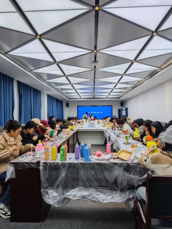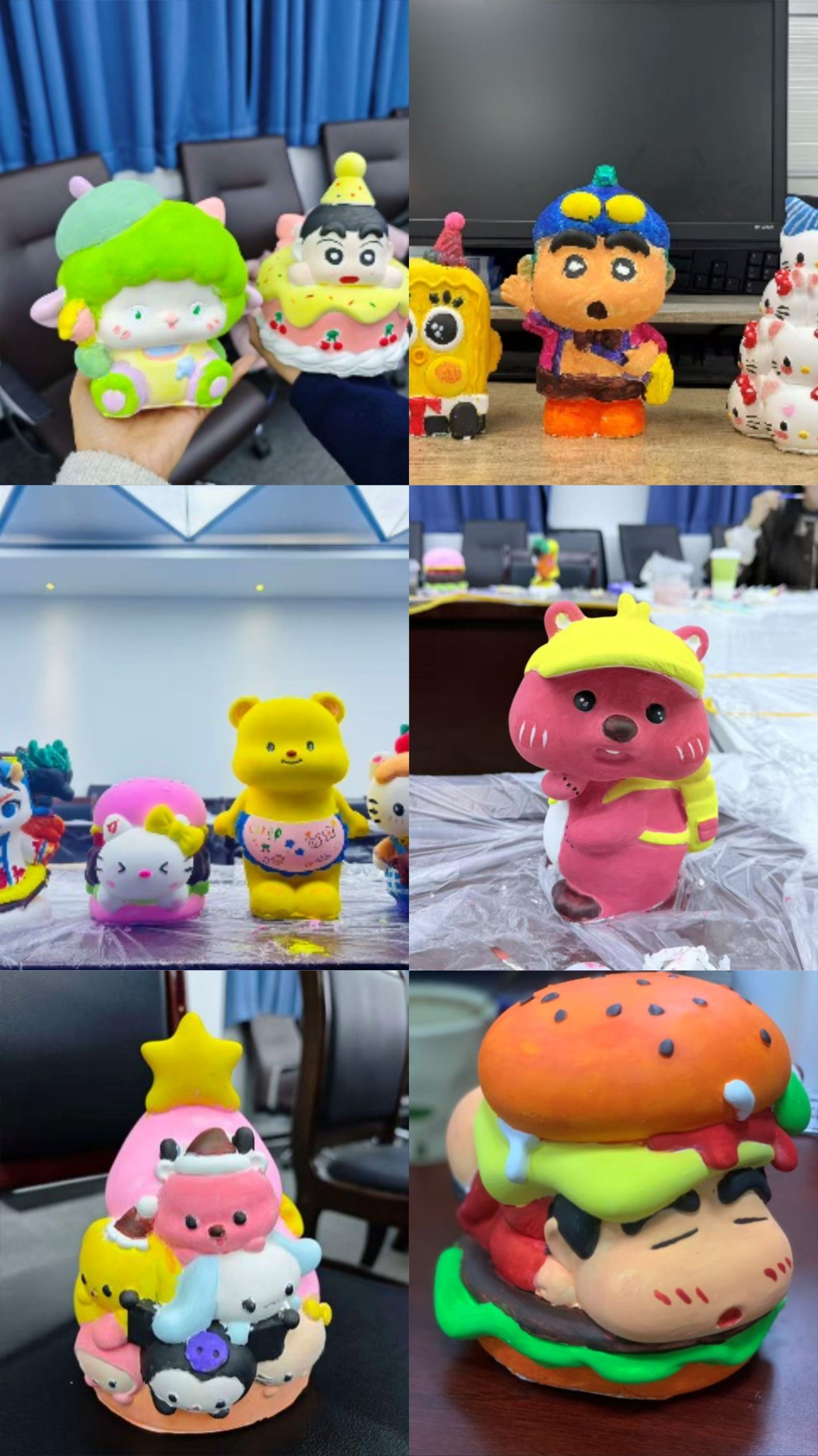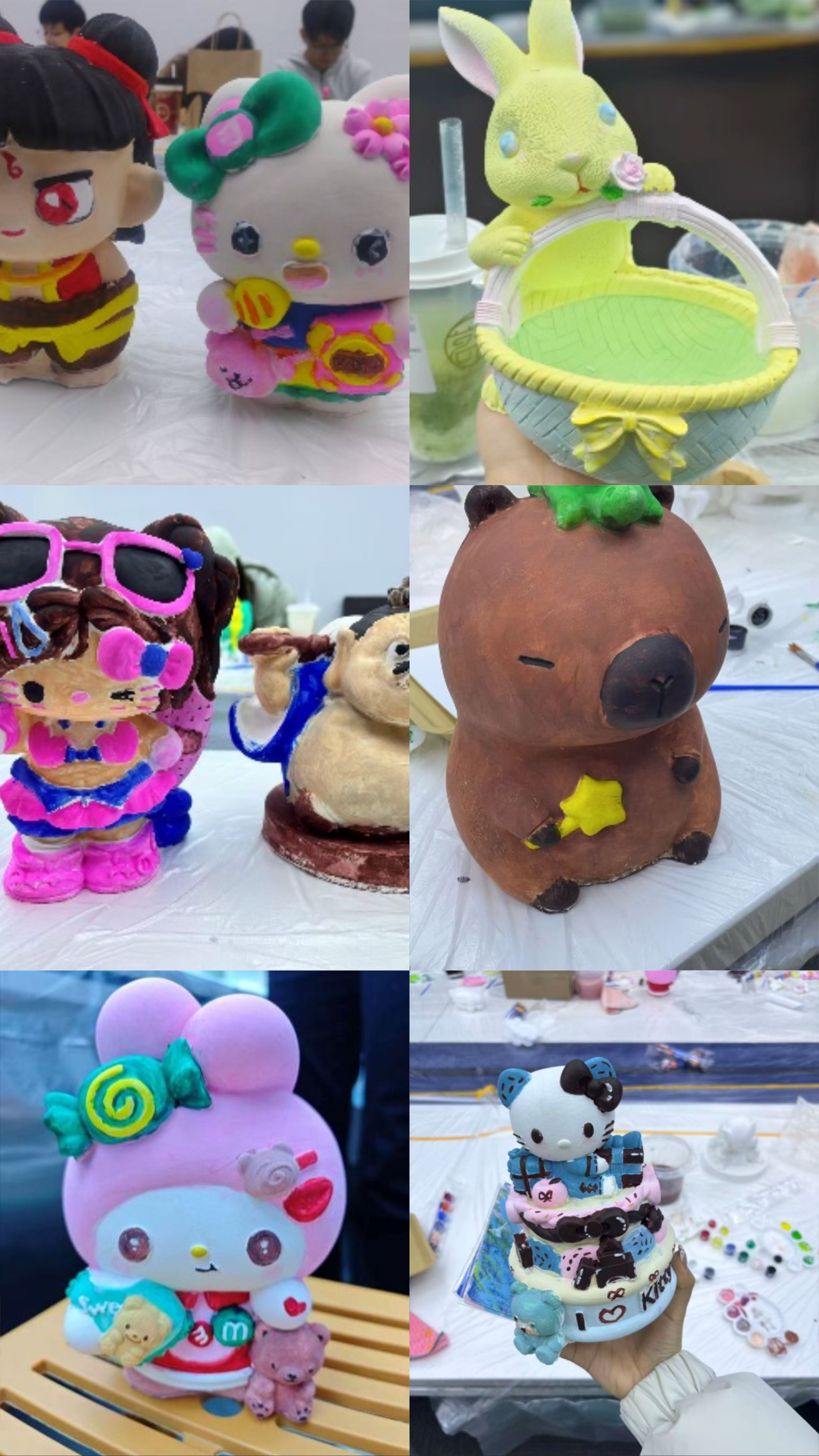 石膏娃娃涂鴉區(qū)洋溢著活潑生動的創(chuàng)作氛圍。同學(xué)們挑選心儀的卡通造型,調(diào)色繪彩、細(xì)心涂抹,為素白石膏注入個性與生機(jī)。李婷婷一邊繪制手中的娃娃,一邊笑著說:“好像回到了小時候,專注涂色的過程特別解壓。”大家互相交流配色心得、分享創(chuàng)作巧思,在笑語盈盈中完成了一件件獨(dú)一無二的作品。短短兩小時,一個個色彩斑斕、風(fēng)格各異的石膏娃娃陸續(xù)誕生,成為同學(xué)們手中可觸摸的童心紀(jì)念。