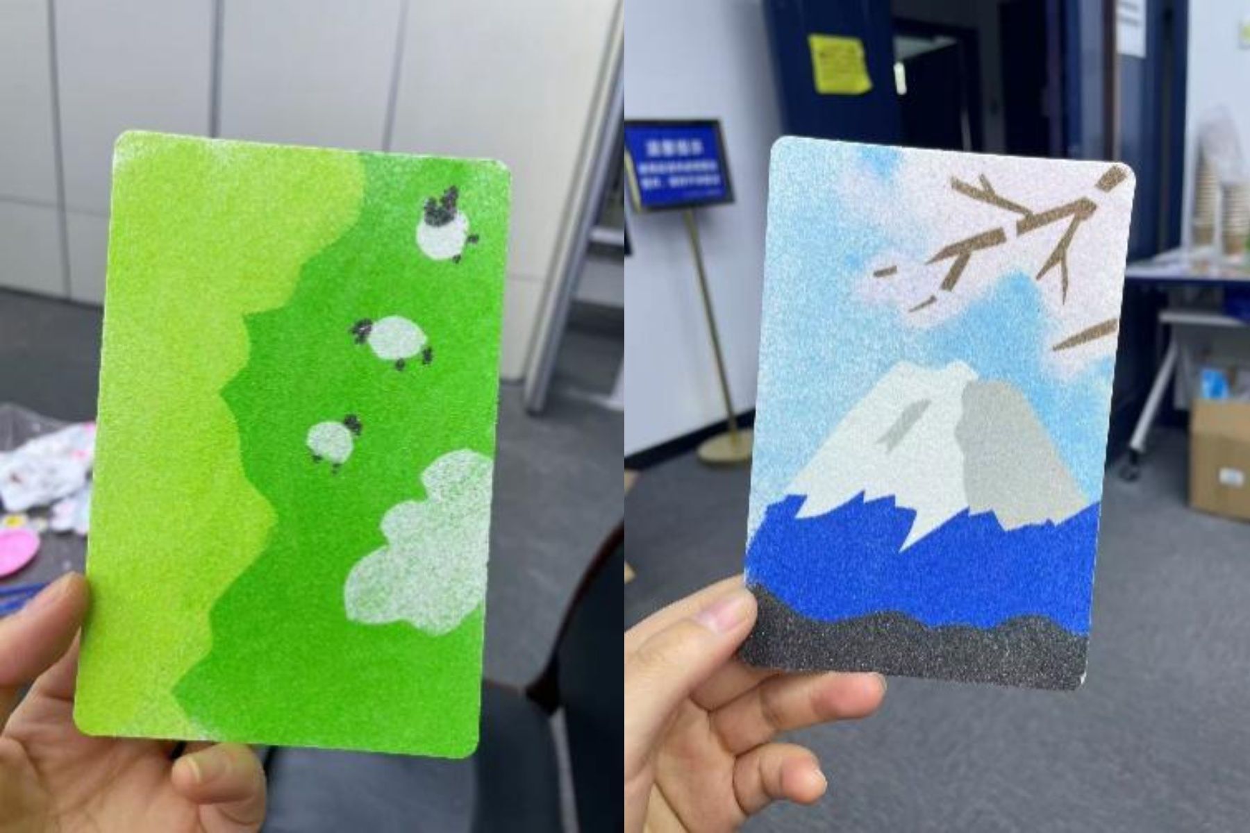 沙畫體驗(yàn)區(qū)內(nèi),同學(xué)們以細(xì)膩彩沙為媒介,在光潔的沙畫紙上鋪灑、勾勒、點(diǎn)染,自由組合出各種圖案。從遠(yuǎn)山層云、湖光樹影的簡約風(fēng)景,到靈動可愛、憨態(tài)可掬的卡通形象,不同色彩與紋理在指尖流轉(zhuǎn)中漸漸成形。現(xiàn)場氛圍輕松愉快,創(chuàng)作中,沙的流動性賦予作品獨(dú)特的呼吸感與即興之美。“動手堆沙、抹平的過程讓人很專注,也能靜下心來。”參與學(xué)生高靜怡分享道。沙畫不僅是一門視覺藝術(shù),更成為一種動態(tài)的冥想方式,讓參與者在專注中舒緩壓力,于流動的創(chuàng)作中收獲一片寧靜而愉悅的心靈角落。