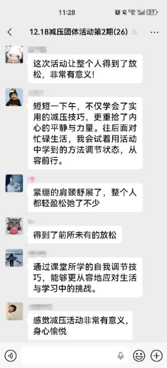 (通訊員 肖若昕 孫群)2025年12月18日下午,數(shù)學(xué)與統(tǒng)計(jì)學(xué)院在南校區(qū)心理健康教育中心團(tuán)體輔導(dǎo)活動(dòng)室順利舉辦了第二期“賦能減壓”團(tuán)體輔導(dǎo)活動(dòng)。本次活動(dòng)以“身心喚醒,從容前行”為主題,由研究生輔導(dǎo)員孫群老師帶領(lǐng),20余名研究生積極參與。