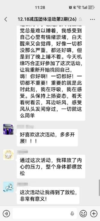 活動(dòng)尾聲,同學(xué)們?cè)趯庫(kù)o的氛圍中進(jìn)行了正念練習(xí)與開(kāi)放式分享。大家坦誠(chéng)交流科研學(xué)習(xí)中的困惑與日常壓力,也在傾聽(tīng)中感受到彼此的理解與支持。最后老師總結(jié):“成長(zhǎng)不是孤身上路,而是在自我覺(jué)察中更好接納自己,更好地與他人相伴。”同學(xué)們普遍反映,此次活動(dòng)不僅學(xué)到了一些實(shí)用的減壓方法,更是體驗(yàn)到了集體的支持與溫暖。這種從應(yīng)該如此到本來(lái)如此的觀念轉(zhuǎn)變,正是心理健康教育追求的終極目標(biāo)——學(xué)會(huì)自我接納,與不完美和解。