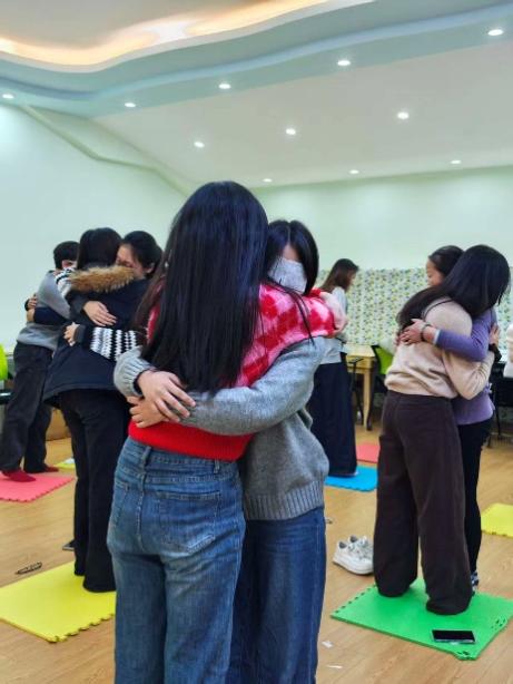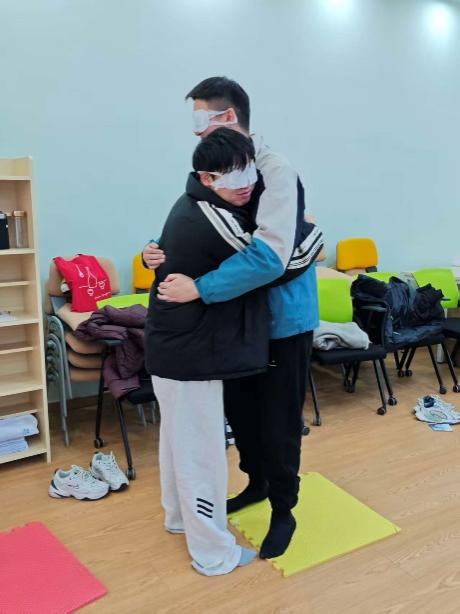 活動(dòng)在舒緩寧?kù)o的氛圍中悄然開(kāi)啟。在老師的輕柔引導(dǎo)下,同學(xué)們跟隨一段簡(jiǎn)短而富有節(jié)奏的“抖動(dòng)練習(xí)”,在七分鐘的音樂(lè)里,漸漸放下思緒的紛擾,將注意力放在自己的身體和呼吸上。身體的輕微搖動(dòng)幫助大家放松緊繃的身體,也在動(dòng)靜之間為接下來(lái)的深度體驗(yàn)鋪就了心靈的溫床。這一環(huán)節(jié)不僅讓身心得到初步的舒展,更在團(tuán)體間悄然構(gòu)筑起一片安全、溫暖而開(kāi)放的交流空間。